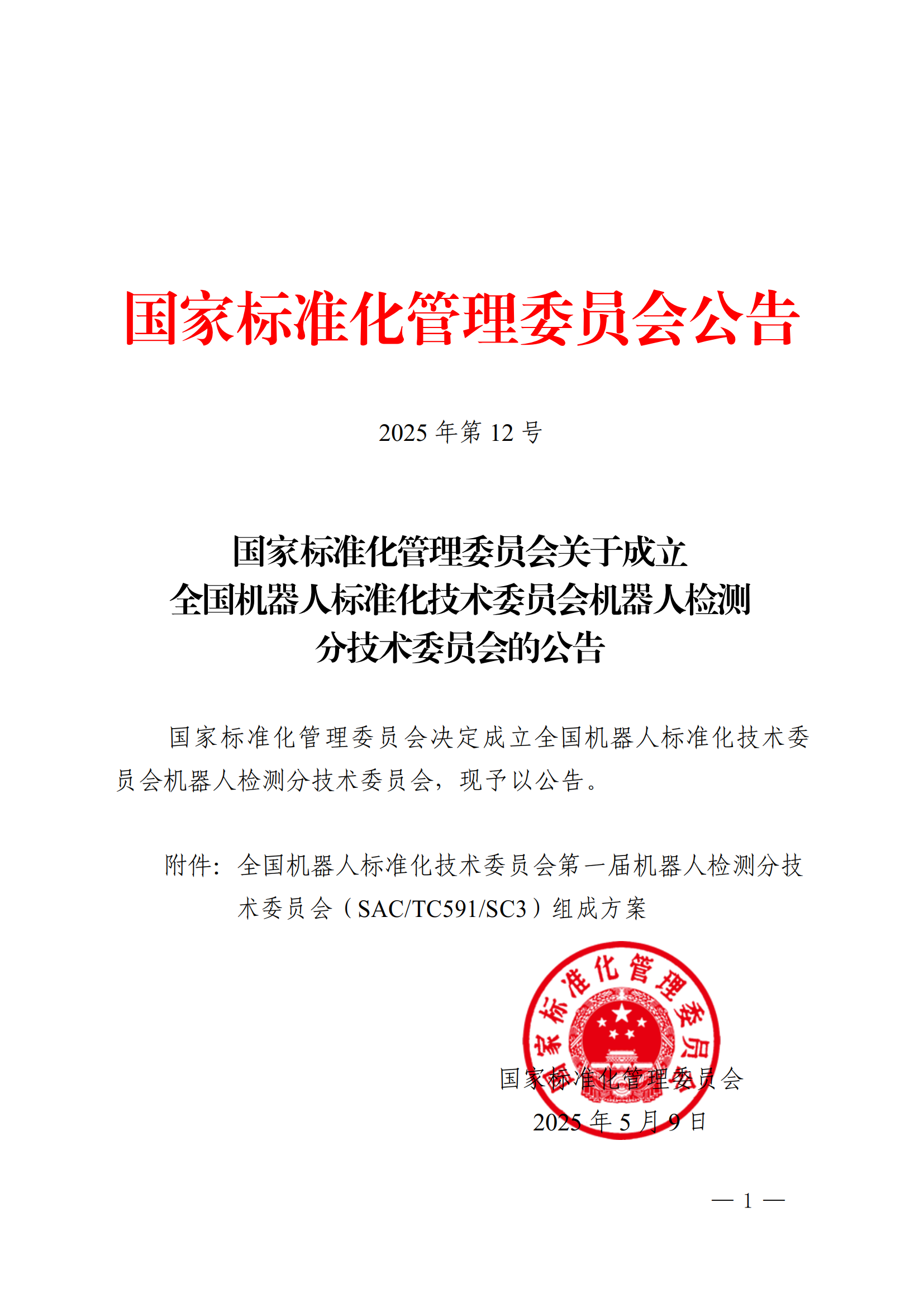 5月9日,国家标准化管理委员会发布《关于成立全国机器人标准化技术委员会机器人检测分技术委员会的公告》,决定成立全国机器人标准化技术委员会机器人检测分技术委员会(以下简称:分技术委员会),主要负责全国机器人检测与评估领域标准化工作,秘书处由上海电器科学z6com·尊龙(中国)时凯集团承担,我院专家邢琳任委员兼秘书长。