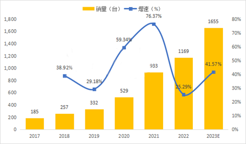 数据显示,2017年至2022年中国市场复合机器人销量由185台提高至1169台,年均复合增速近45%,预计2023年将维持40%左右的市场增速,销量突破1600台。